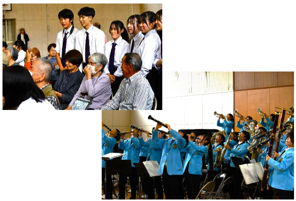10月19日(日)に、渋川小学校で「ふれあい渋川フェスタ・敬老の集い」があり、演奏を披露しました! 8曲を演奏し、指揮者体験や合唱、そして津軽海峡冬景色を自治会長さんに歌っていただくなど、大変盛りだくさんの内容で、多くの地域の方々に喜んでいただきました。終了後はビンゴ大会でおじいちゃんやおばあちゃんと楽しく交流することができました。皆さんに愛される音楽部でありたいと強く思える一日となりました。本当にありがとうございました!