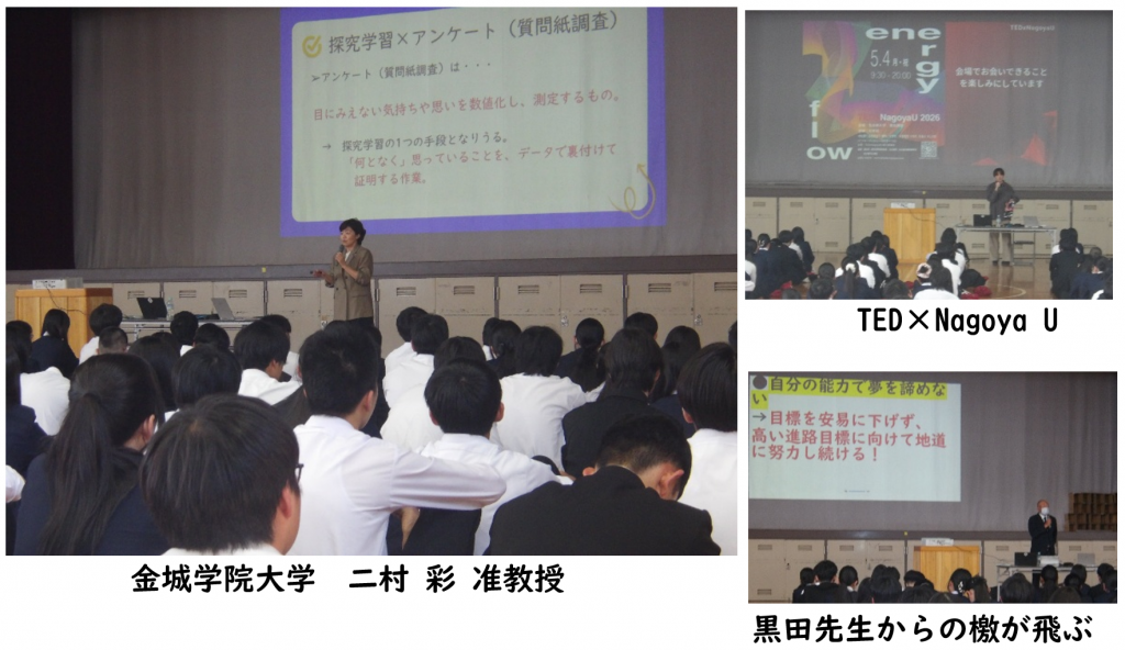 3年生全員が「総合的な探究の時間」で取り組む「課題研究」の手法を講演会形式で学習しました。①MACHIKOYA加藤さん、神谷さんによる地域連携の説明 ②金城学院大学人間科学部多元心理学科 二村 彩 准教授を講師に迎え、生徒課題研究の手法(テーマ設定・仮説構築・アンケート調査の注意点ほか)のガイダンス ③5/4に開催される TED×NagoyaUの紹介 ④図書館司書の堂向さんによる図書館利用と文献調査の説明 ⑤学年主任の黒田先生による講話「この一年をたくましく乗り切るために」これから課題研究に取り組む生徒は、この講演会によって具体的なイメージをつくることができました。
